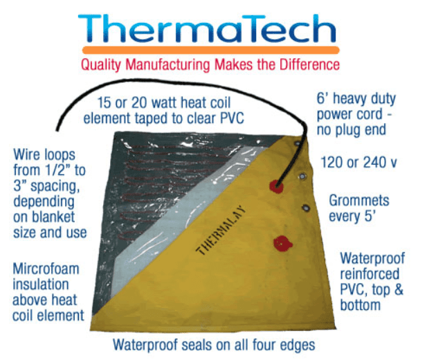 - Material Readiness – Many of the materials used on construction sites perform at suboptimal levels when they drop below certain temperatures. Spackle gets brittle; paint flows less freely; asphalt binds less freely. Heating construction blankets solve these problems and more. Simply drape the blankets over piles of cold patch, roofing shingles, and other site-staged materials overnight so they are ready to use the next day. Covering piles of damp gravel, aggregate, or sand will prevent temperatures underneath from dropping low enough to freeze the moisture and bind materials together. Heated construction blankets are also perfect for safely warming fuel lines while consuming less energy than heaters. Heated construction blankets also can protect supplies kept in unheated warehouses, on pallets, and in drums. Much more efficient and safer than space heaters, blankets can be fitted to barrels and totes. ThermaTech heated construction blankets, for example, easily fold into whatever modular shape is required. ThermaTech even manufactures a blanket that form fits 55-gallon drums for efficient protection against liquids freezing. The company offers custom-made shapes and sizes to keep specialty equipment running. The company uses advanced technology to distribute heat evenly throughout the blanket, making thermostats unnecessary.
