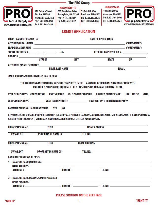 Want to purchase or rent with The Pro Group and need a credit application? Complete our credit application and fax or mail it to our Waltham Office: