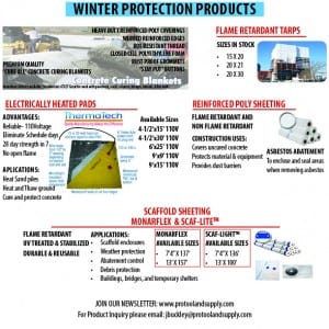 Jobsite ProtectionPoly Sheeting, Flame Resistant Tarps, Heated Pads, etc.Keeping your jobsite protected from the harsh winter months is imperative. Cold months does not have to mean slower production. We can keep you on schedule and out of the elements. |