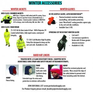 Winter Apparel & AccessoriesJackets, Gloves, Hats, etc.Staying warm through the winter is key to keeping your workers comfortable and your job on schedule. We offer an extensive selection of winter accessories geared toward warmth and comfort.